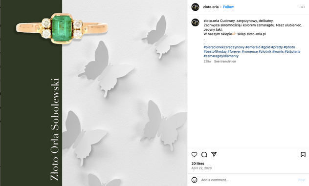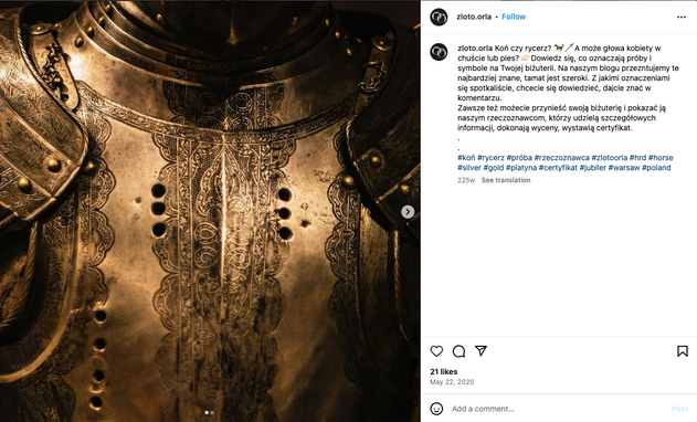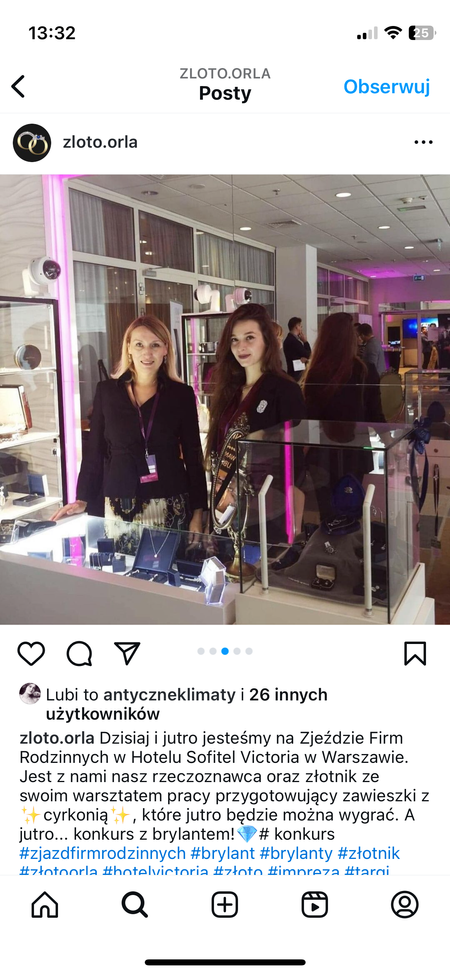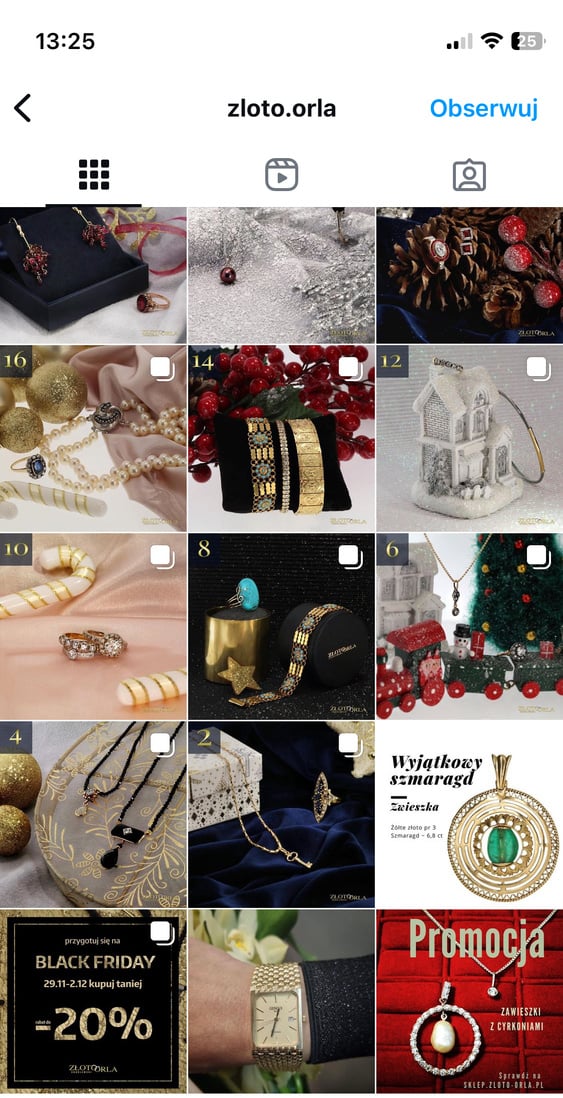 zadanie: prowadzenie profilu firmowego na instagramie poprzez realizację estetycznych zdjęć i grafik oraz angażowanie odbiorców dzięki ciekawym akcjom promocyjnym - po prawej stronie: posty z kalendarza adwetowego dla Złoto Orla (codziennie nowa propozycja prezentu jubilerskiego pod choinkę)