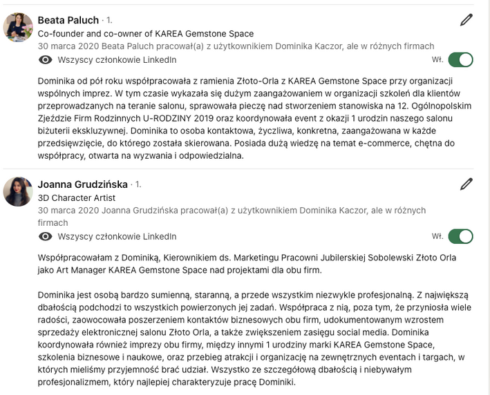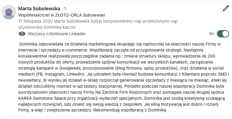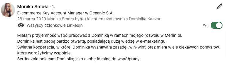 Zaangażowanie w obowiązki, bardzo dobra organizacja pracy pozwalają mi na efektywne prowadzenie projektów marketingowych.
